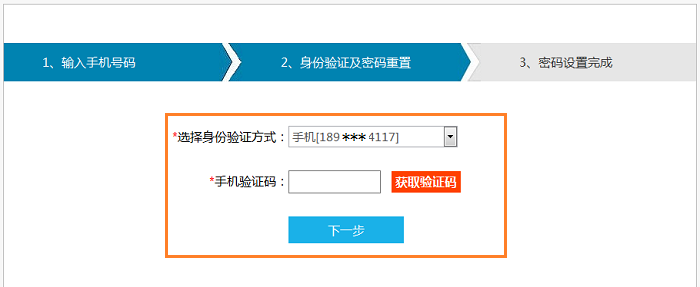(2)按照提示输入手机号、验证码→点击【下一步】
