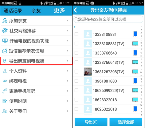 2、勾选需要导出的亲友->确定【导出】->选择盒子号码