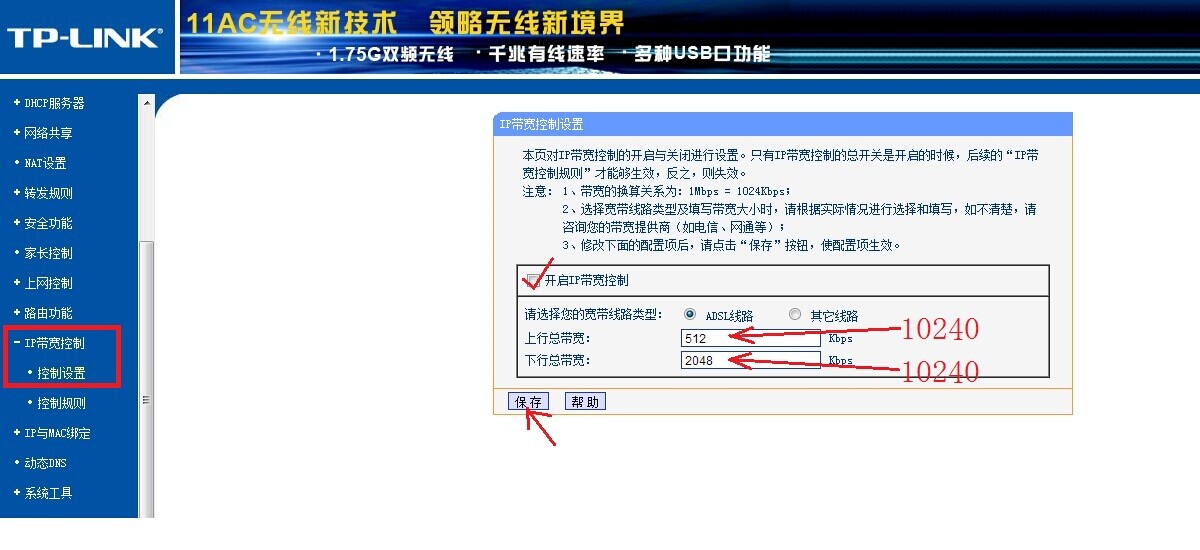 2.对电视盒子连接的路由器带宽需要设置。如下图所示,“IP带宽控制”->“控制设置”,勾选“启用IP带宽控制”,上行总带宽与下行总带宽都设置为10240Kbps,点选“保存”